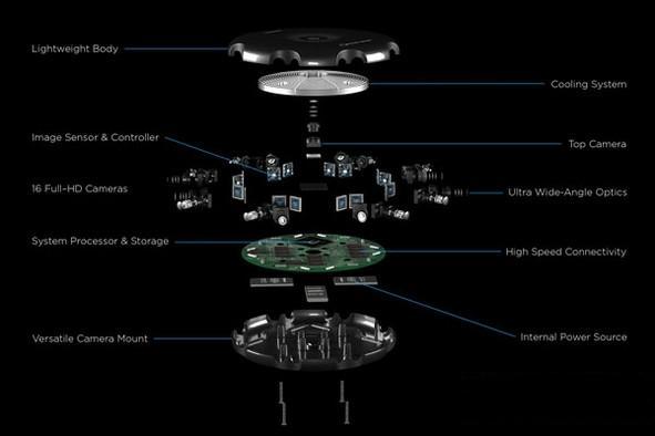 Beyond相機(jī)呈圓形,邊緣分布了16個高清攝像頭,能拍攝360度全景3D影像,并將各攝像頭所拍攝到的內(nèi)容拼接到一起,合成完整視頻,然后可以通過Gear VR進(jìn)行觀看。